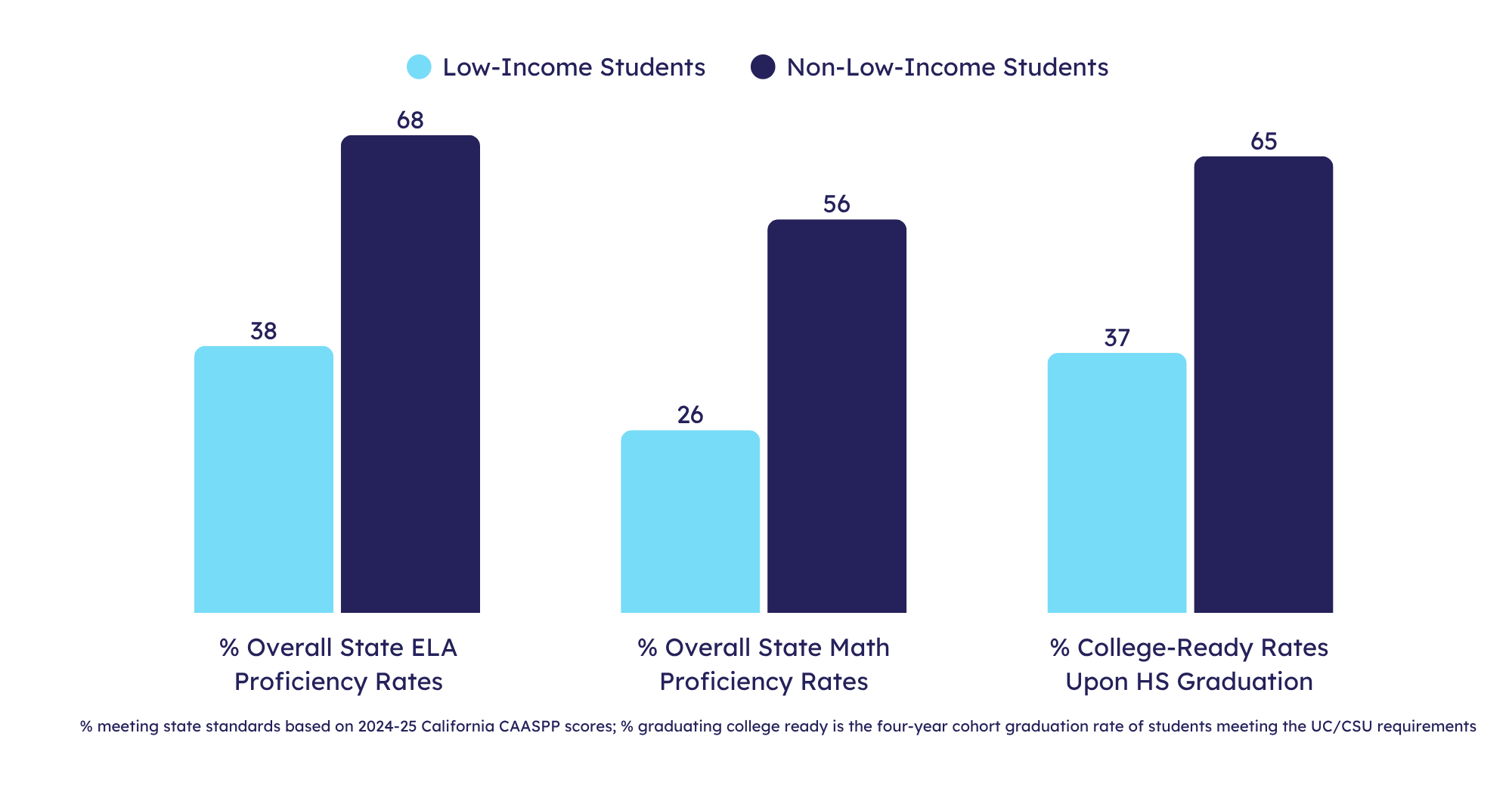This perpetuates deep inequities in our current education system for the over 3.5 million students from low-income communities in California. On every meaningful measure of performance and readiness, children from low-income communities–who are disproportionately Black and Latino–fare far worse than their higher-income peers.